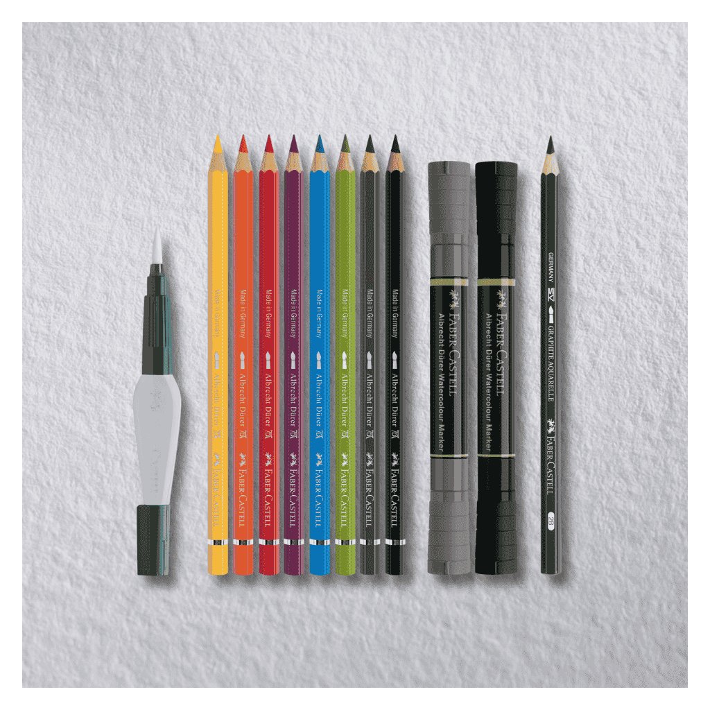 Akvarelové ceruzky Albrecht Dürer umožňujú umelcovi používať rôzne výrazy v kresbe, maľbe a akvarele. Vysokokvalitné materiály a viac ako 250-ročné skúsenosti Faber-Castell zaručujú, že tieto akvarelové ceruzky sú neprekonateľné vo svojej svietivosti. Len niekoľkými ťahmi štetca je možné farbu naniesť jemne alebo na veľkú plochu, čím odhalia svoju plnú, jedinečnú farebnú silu. V závislosti od použitého papiera je možné nános farby úplne rozpustiť a potom sa správa ako klasická akvarelová farba.