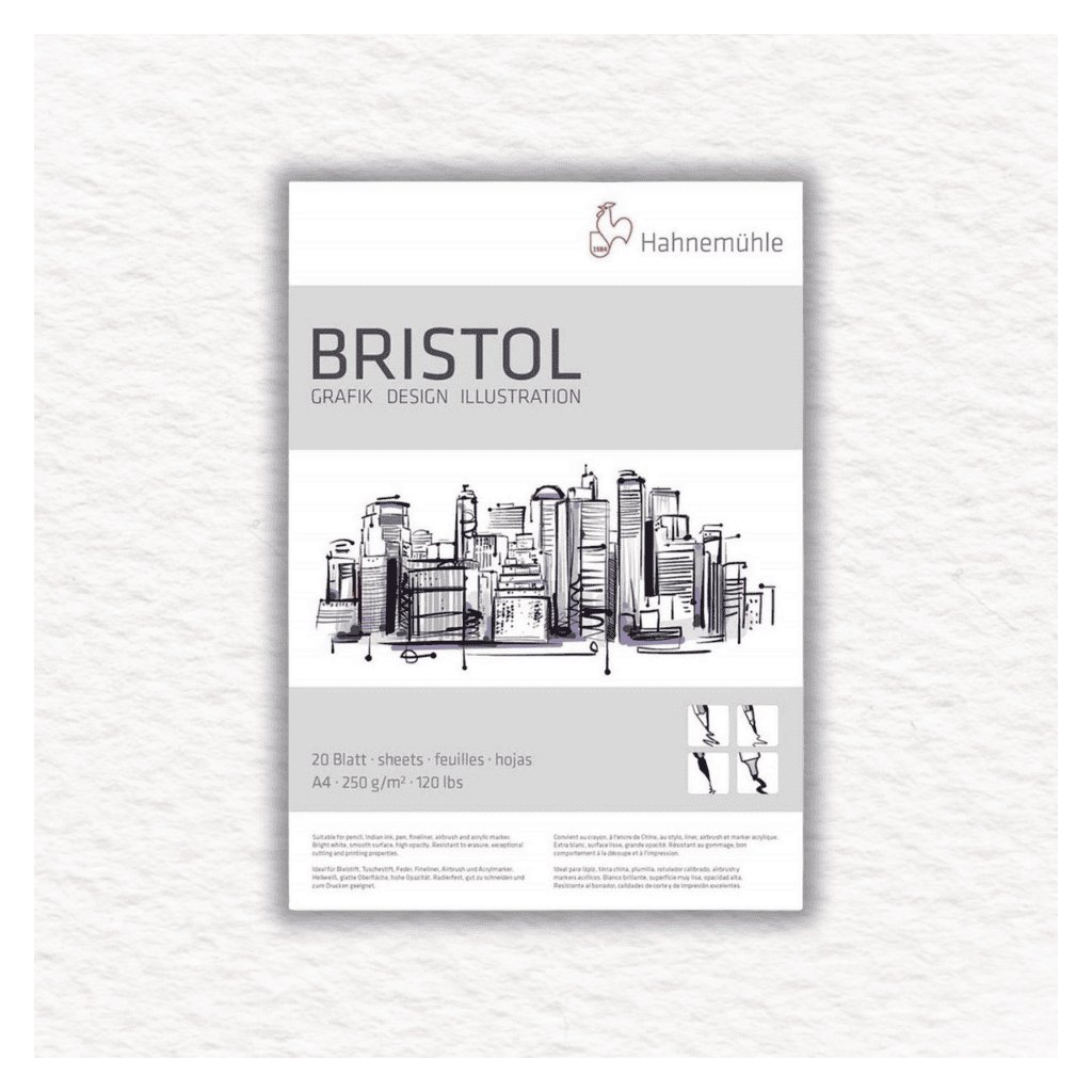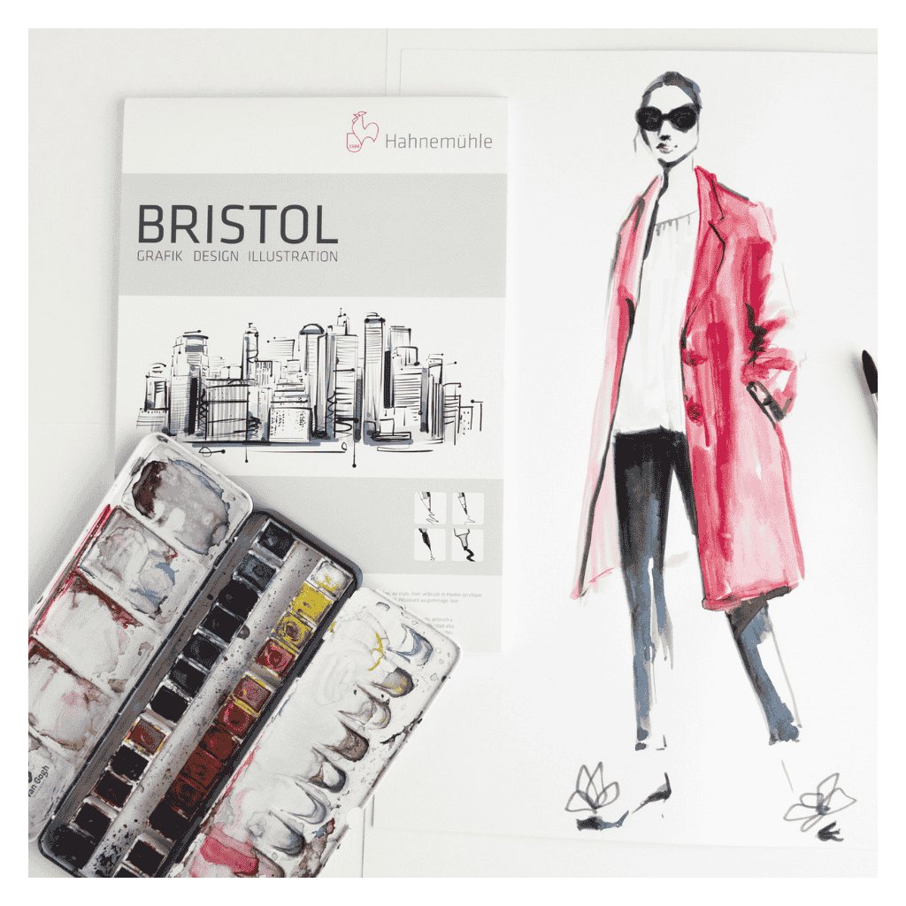 Skicár Hahnemühle Bristol 250 gr/m2 je ideálny pre návrhy, štúdie, ilustrácie a kresby alebo výtlačky. Pevný, ultra hladký povrch umožňuje prácu so suchými a tekutými ťahacími médiami. Ceruzky, farebné ceruzky, perá s atramentom, plniace perá, jemné linky a akrylové markery, to všetko sa kĺže po hladkom povrchu papiera a vytvára nepriehľadnú farebnú vrstvu. Papier je vhodný aj na použitie s airbrushmi.