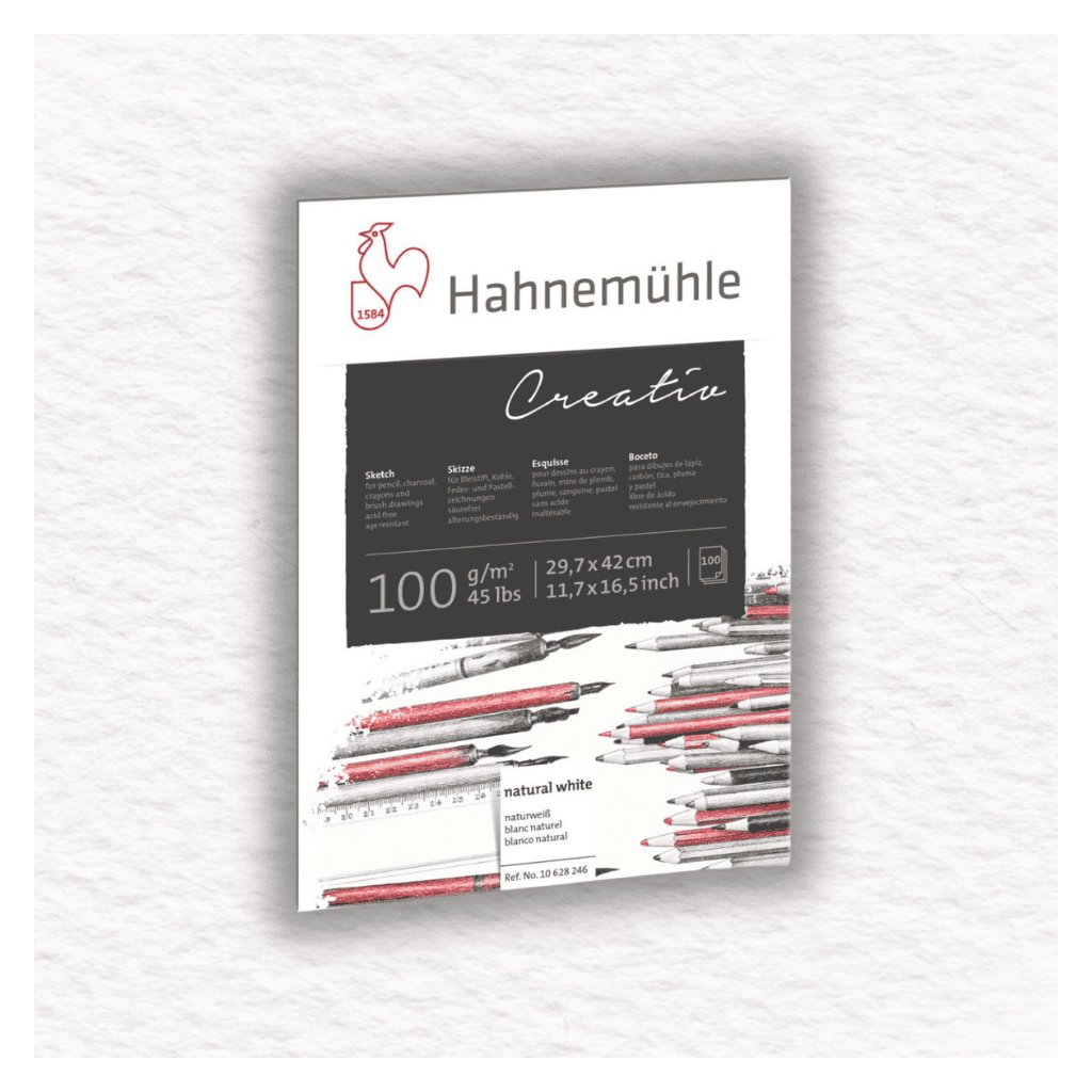 Lepený skicár Hahnemühle - Creativ - 100 gr/m2 má jemný, mäkký papier s vysokou kapacitou. Jemná, matná povrchová štruktúra papiera umožňuje rovnomerné nanášanie farieb. Prírodne biely papier pomáha zabezpečiť, aby farby vyzerali mäkké a nezaťažené.