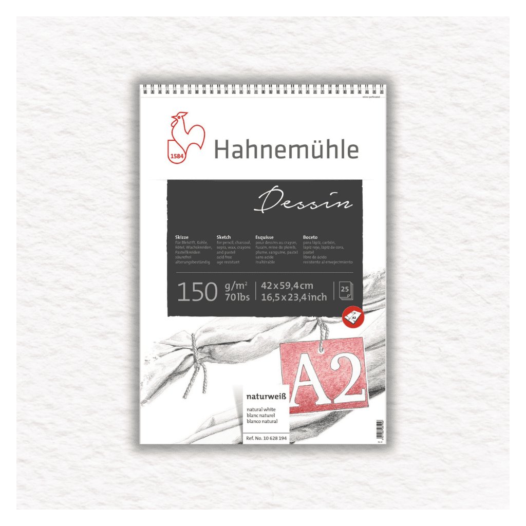 Špirálový skicár Hahnemühle - Dessin - 150 gr/m2 má papier s prirodne bielym tónom, ktorý vytvára dobré kontrasty a vysokú úroveň živosti farieb. Vyzerá a pôsobí veľmi hladko, ale vyznačuje sa jemnou zrnitosťou zaručujúcou vynikajúcu absorbciu farieb.