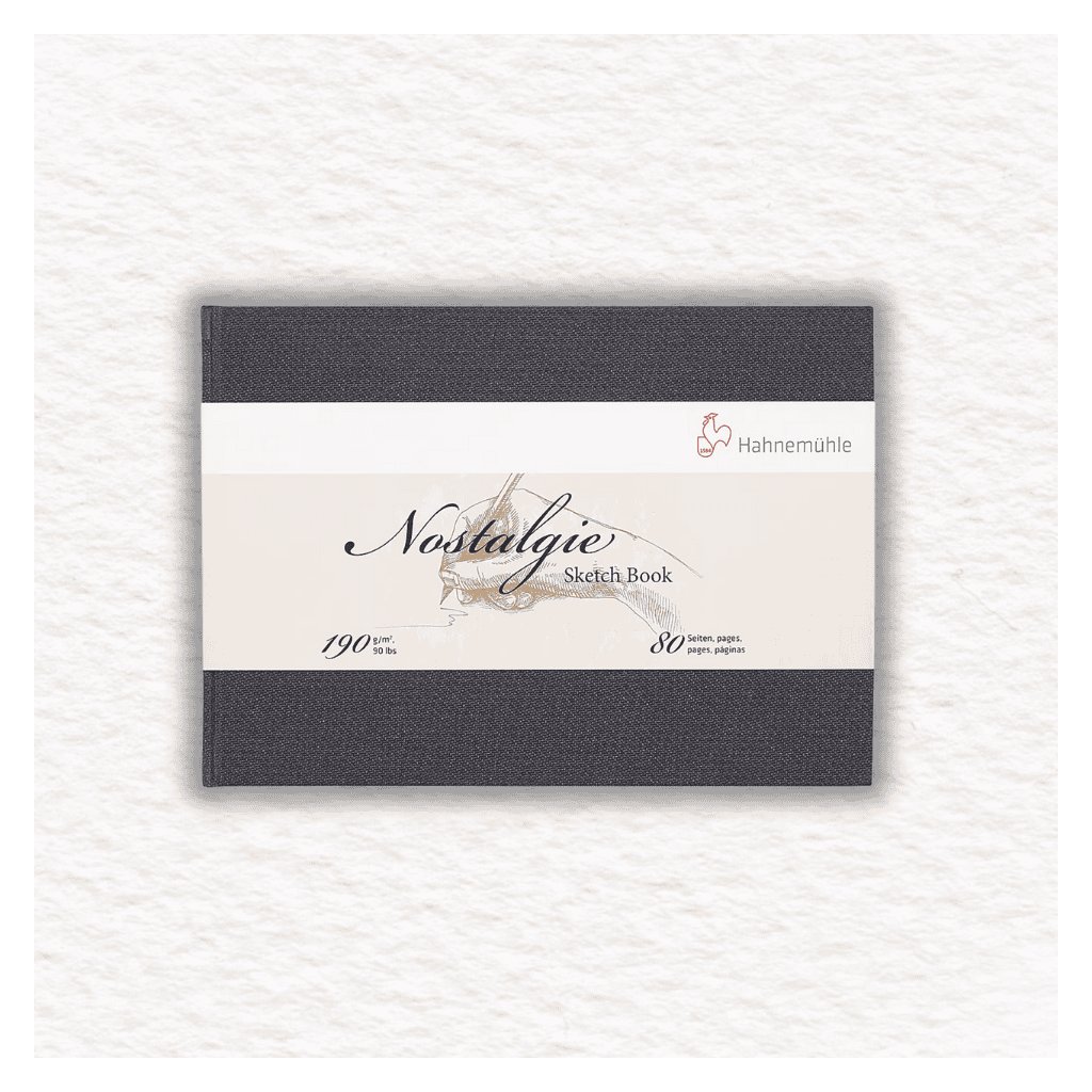 Skicár Hahnemühle Nostalgie 190 gr/m2 má ťažký, prírodne biely papier, ktorý je pevný a pružný. Jeho textúra a kvalita umožňuje akýkoľvek druh práce od architektonického náčrtu až po rýchly, živý farebný náčrt. Vďaka knižnej väzbe antracitovej farby s ľanovou štruktúrou je skicár odolný a príjemný na dotyk. Zošívanie nití zaisťuje pevnú väzbu a dobrú rovinnosť listov, čo zaisťuje, že obojstranné náčrty a kresby cez záhyb možno vytvárať bez problémov.