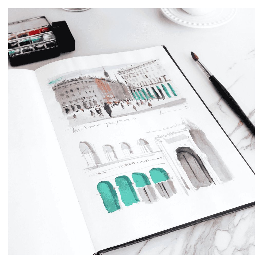 Skicár Hahnemühle Sketch book - 120 gr/m2 má papiere prirodne bielej farby, ktorá umožňuje silné kontrasty a veľkú chromatickú intenzitu v kresbách. Je ideálny na kreslenie ceruzkou, uhlíkom alebo rudkou najmä pre mestské tématiky.