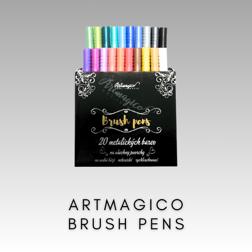 Brush pens - spájajú výhody dvoch maliarskych nástrojov a to markera a štetca. Brush pen je teda marker s hrotom, ktorý je veľmi podobný štetcu. Taký hrot je vysoko prispôsobivý a vďaka nemu zvládnete vytvoriť rôzne hrúbky liniek.