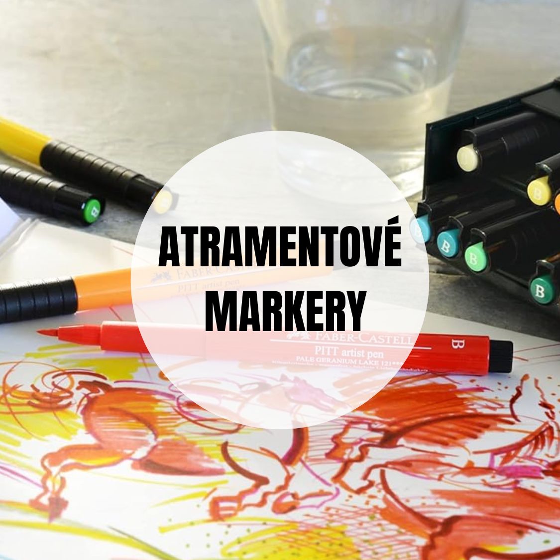 Atramentové markery - atrament bol vždy veľmi obľúbený u umelcov. Jeho všestrannosť umožňuje kombinovať atrament s mnohými maliarskymi technikami, ako je napríklad akvarel. Sú vyrobené predovšetkým z vody a zvyčajne nejakého typu farbiaceho atramentu. Tento typ markerov možno priradiť k bežným markerom, ktoré deti často používajú na kreslenie a vyfarbovanie. Majú tendenciu byť bez zápachu a nehorľavé, a preto sú bezpečnejšie pre mladších umelcov alebo akéhokoľvek umelca s citlivosťou na určité chemikálie a pachy.