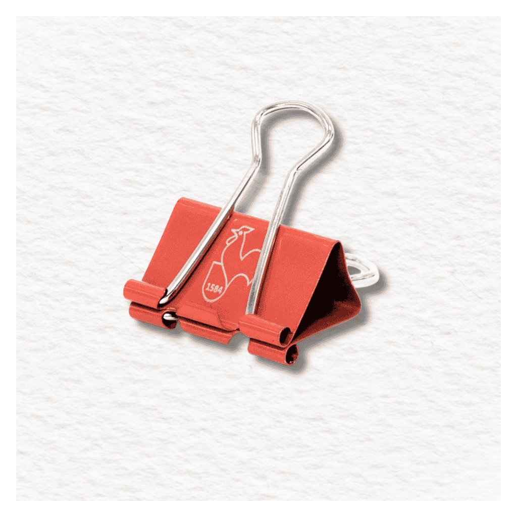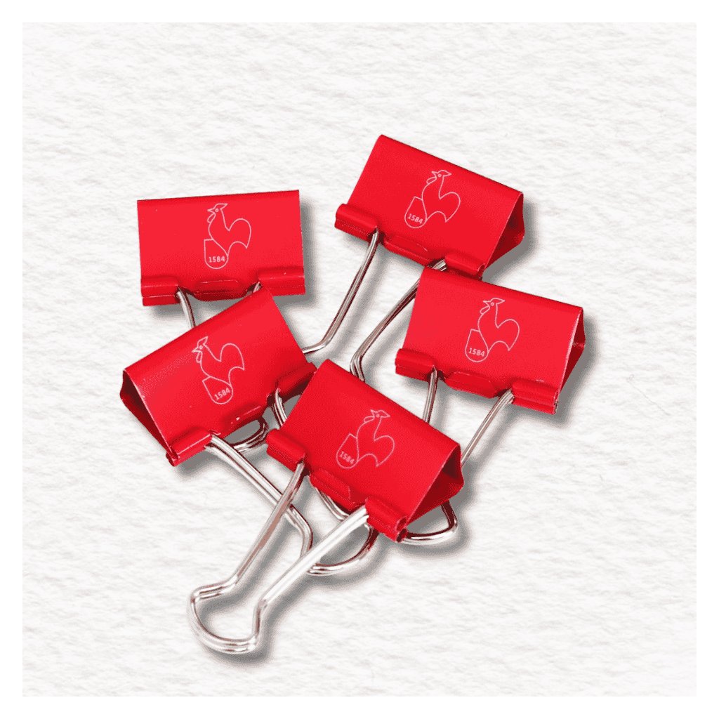 Červené skladacie buldočie klipsy s logom kohúta Hahnemühle držia umelecké diela pohromade a strany zošita na mieste pri skicovaní vonku. Pekne to vyzerá aj pri fotení vašej práce.