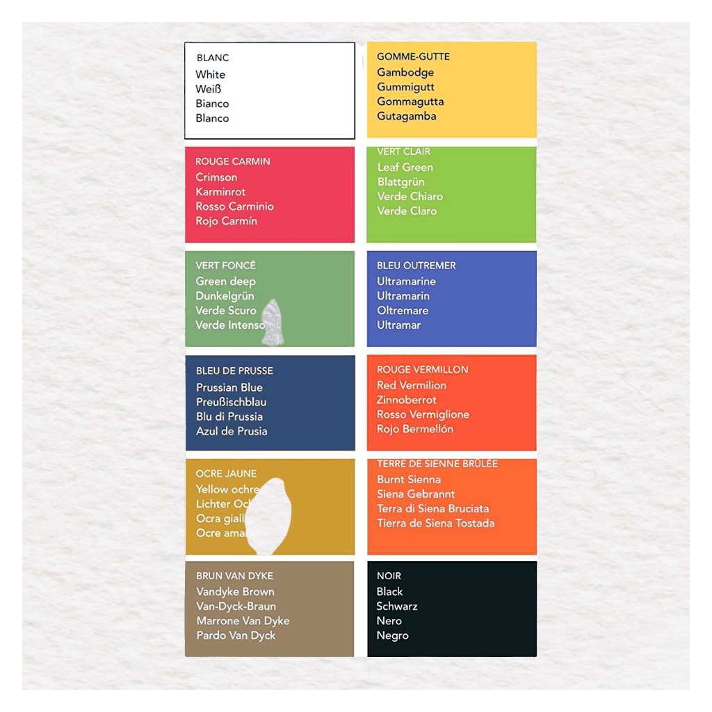 - odtiene: Lemon Yellow, Cadmium Yellow Light, Cadmium Red, Purple Lake, Ultramarine, Intense Blue, Viridian, Yellow Ochre, Raw Sienna, Burnt Umber, Payne’s Grey, Chinese White