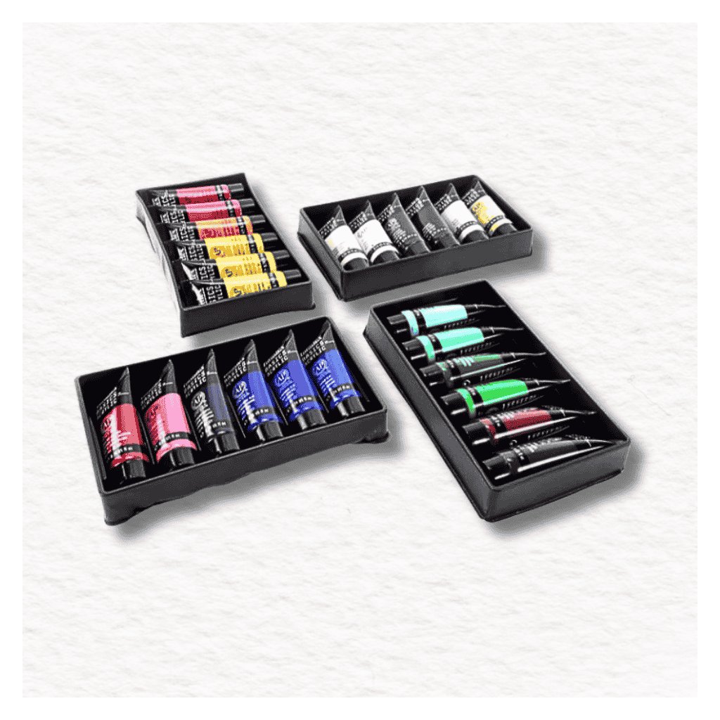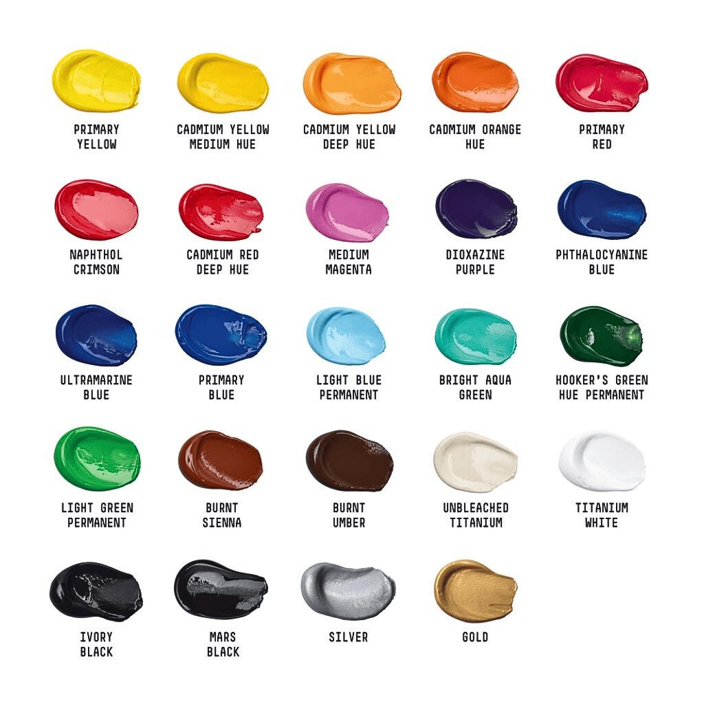 - odtiene: Bright Aqua Green, Burnt Sienna, Burnt Umber, Cadmium Orange Hue, Cadmium Red Deep Hue, Cadmium Red Medium Hue, Cadmium Yellow Deep Hue, Cadmium Yellow Medium Hue, Dioxazine Purple, Iridescent Gold, Iridescent Silver, Ivory Black, Mars Black, Medium Magenta, Naphthol Crimson, Permanent Green Light, Permanent Hooker's Green, Permanent Light Blue, Phthalo Blue, Primary Blue, Primary Yellow, Titanium White, Ultramarine Blue, Unbleached Titanium