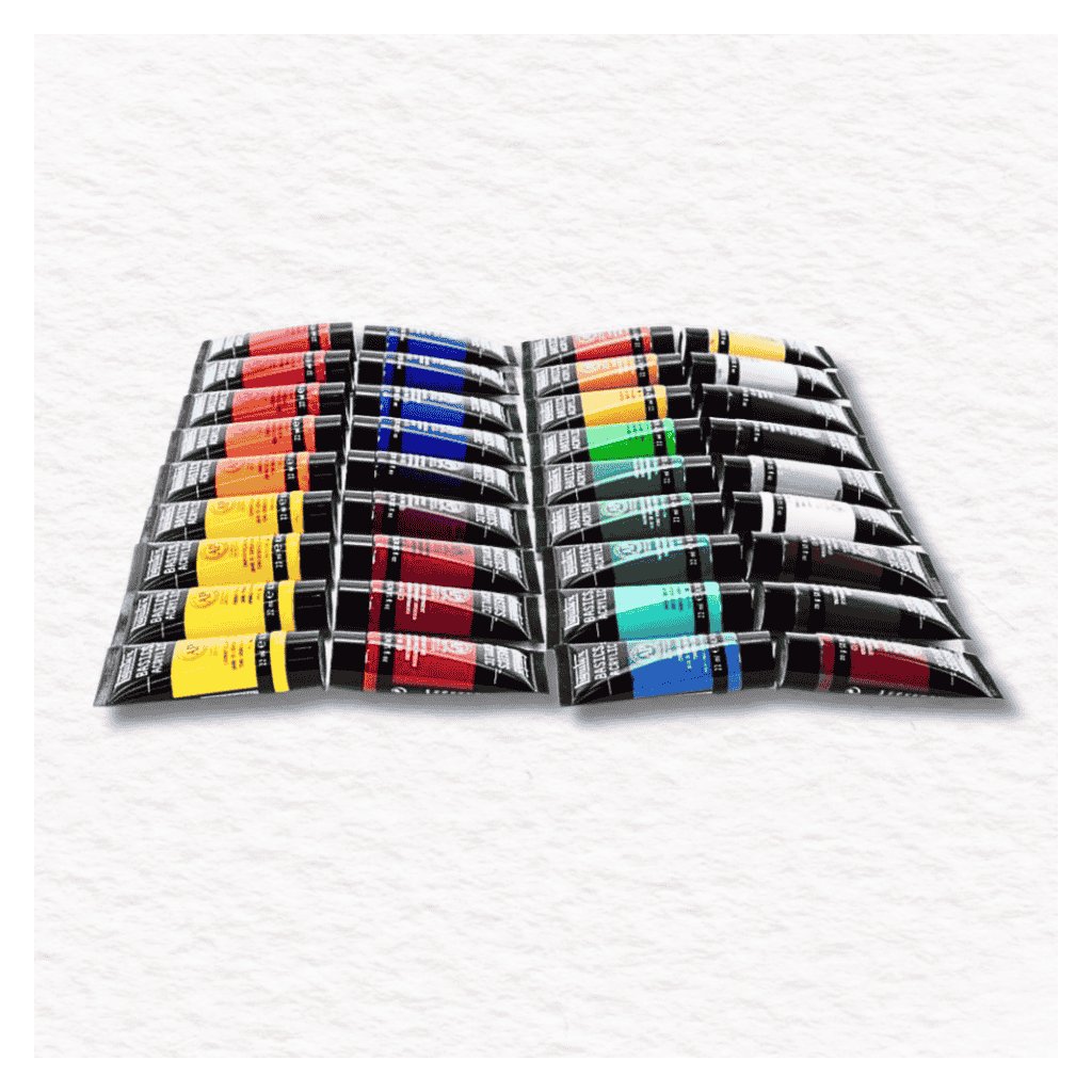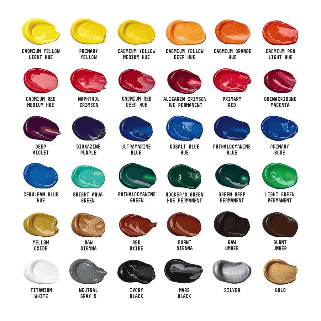 - odtiene: Alizarin Crimson Hue, Burnt Sienna, Burnt Umber, Cadmium Orange Hue, Dioxazine Purple, Ivory Black, Light Green Permanent, Phthalo Green, Primary Blue, Primary Red, Primary Yellow, Titanium White, Cadmium Red Light Hue, Cadmium Yellow Medium Hue, Cerulean Blue Hue, Cobalt Blue Hue, Hooker's Green Hue Permanent, Phthalo Blue, Quinacridone Magenta, Raw Sienna, Raw Umber, Red Oxide, Ultramarine Blue, Yellow Oxide, Bright Aqua Green, Cadmium Red Deep Hue, Cadmium Red Medium Hue, Cadmium Yellow Deep Hue, Cadmium Yellow Light Hue, Deep Green Permanent, Deep Violet, Gold, Neutral Gray Value 5, Silver, Naphthol Crimson, Mars Black