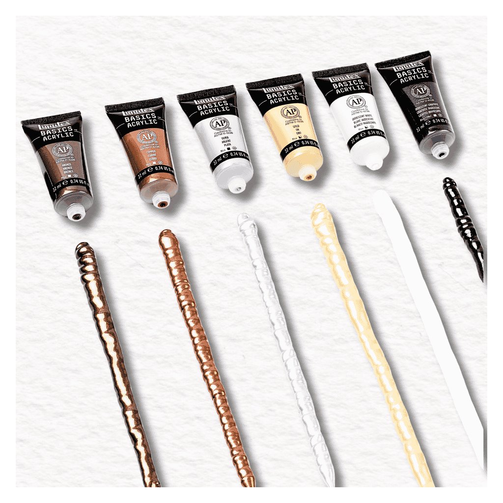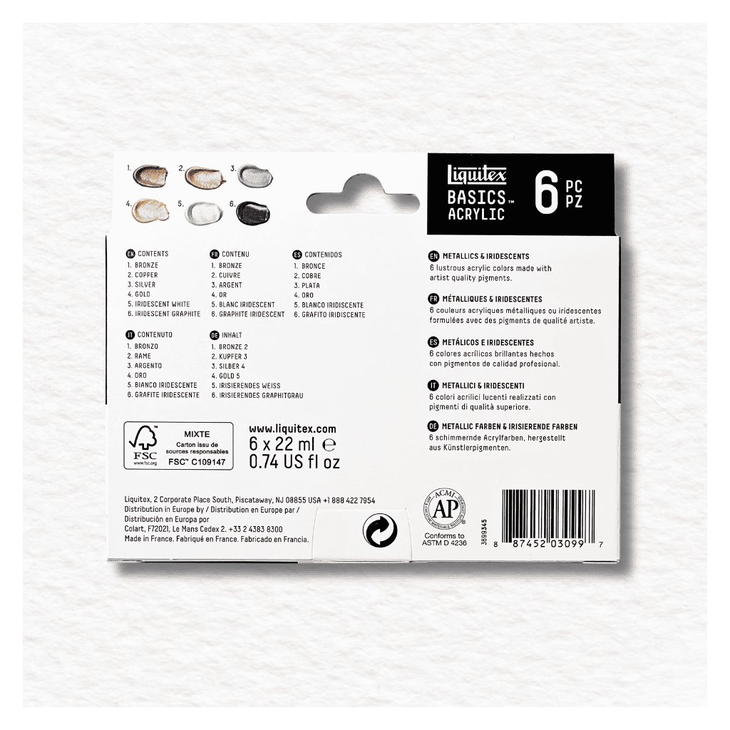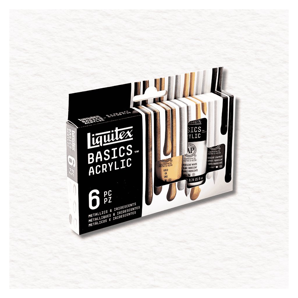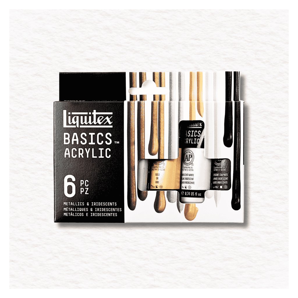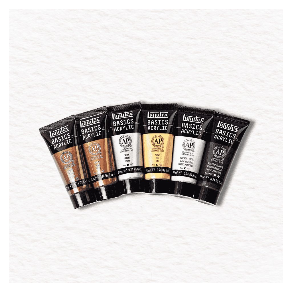 Akrylové farby Liquitex Basics - Metallics & Iridescents - 6x22 ml sú z rady študentskej kvality, vyrobené na každodenné použitie pre umelcov všetkých úrovní. Obsahujú metalické akrylové farby so strednou konzistenciou, vyrobenou zo svetlostálych umeleckých pigmentov.