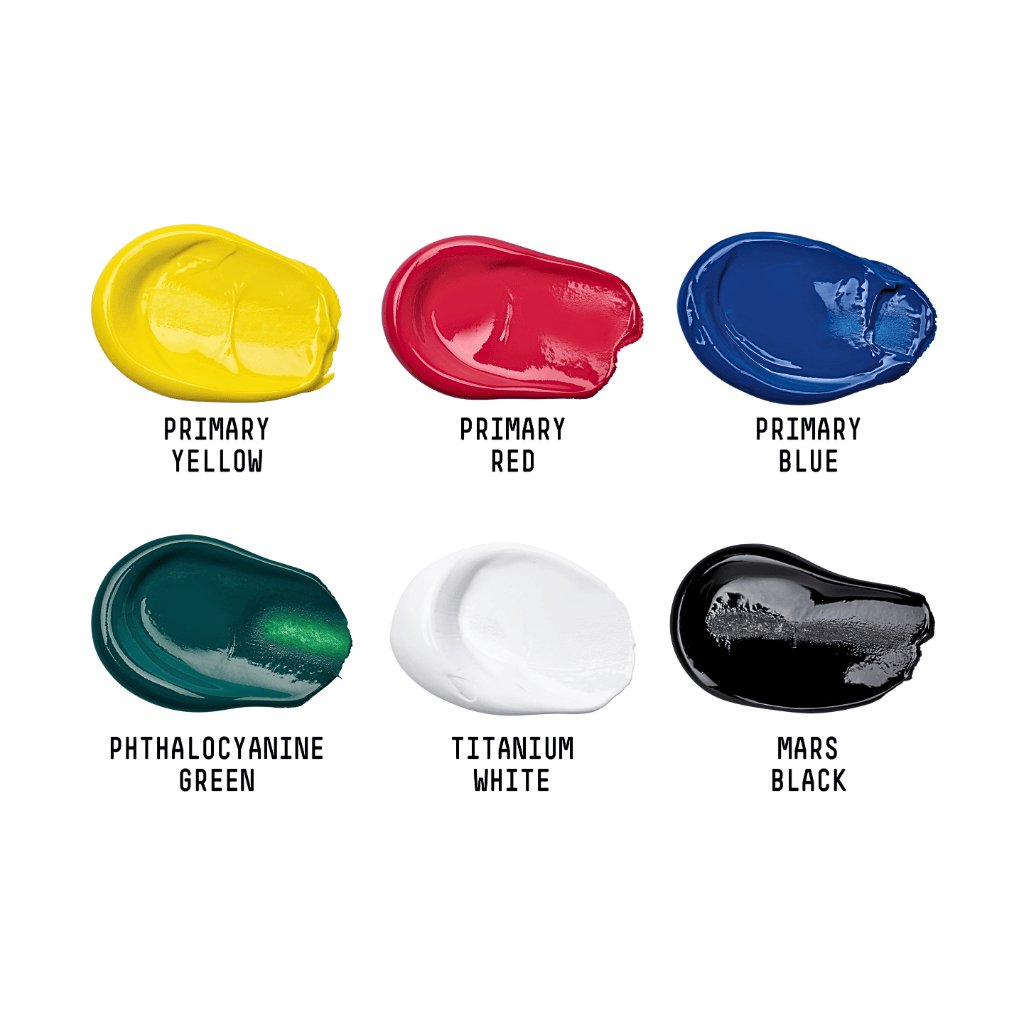 - odtiene: Primary Yellow, Primary Red, Primary Blue, Phthalocyanine Green, Titanium White, Mars Black