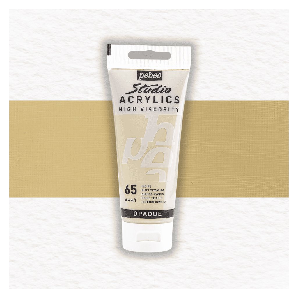 Akrylová farba Pébéo Studio Acrylics High Viscosity - 65 Ivory Buff Titanium je farba so saténovým matným povrchom. Hustá konzistencia farby je po zaschnutí trvalá a film je pevný a pružný voči deformácii.