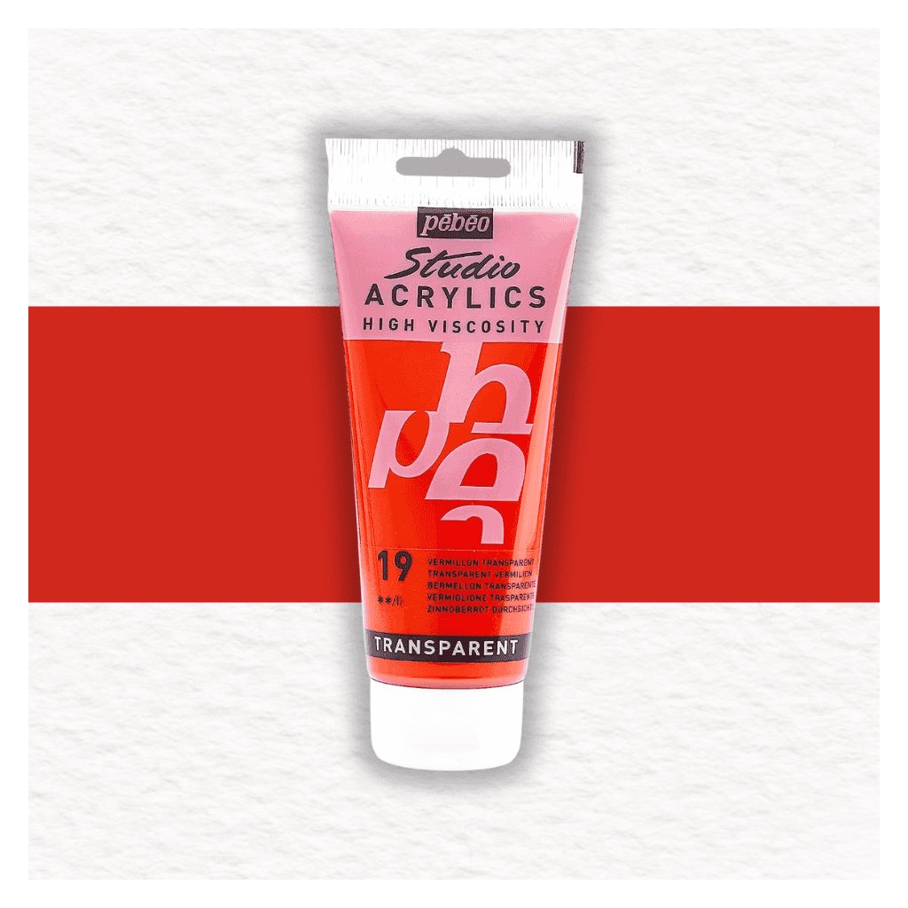 Akrylová farba Pébéo Studio Acrylics High Viscosity - 19 Transparent Vermilion je farba so saténovým matným povrchom. Hustá konzistencia farby je po zaschnutí trvalá a film je pevný a pružný voči deformácii.
