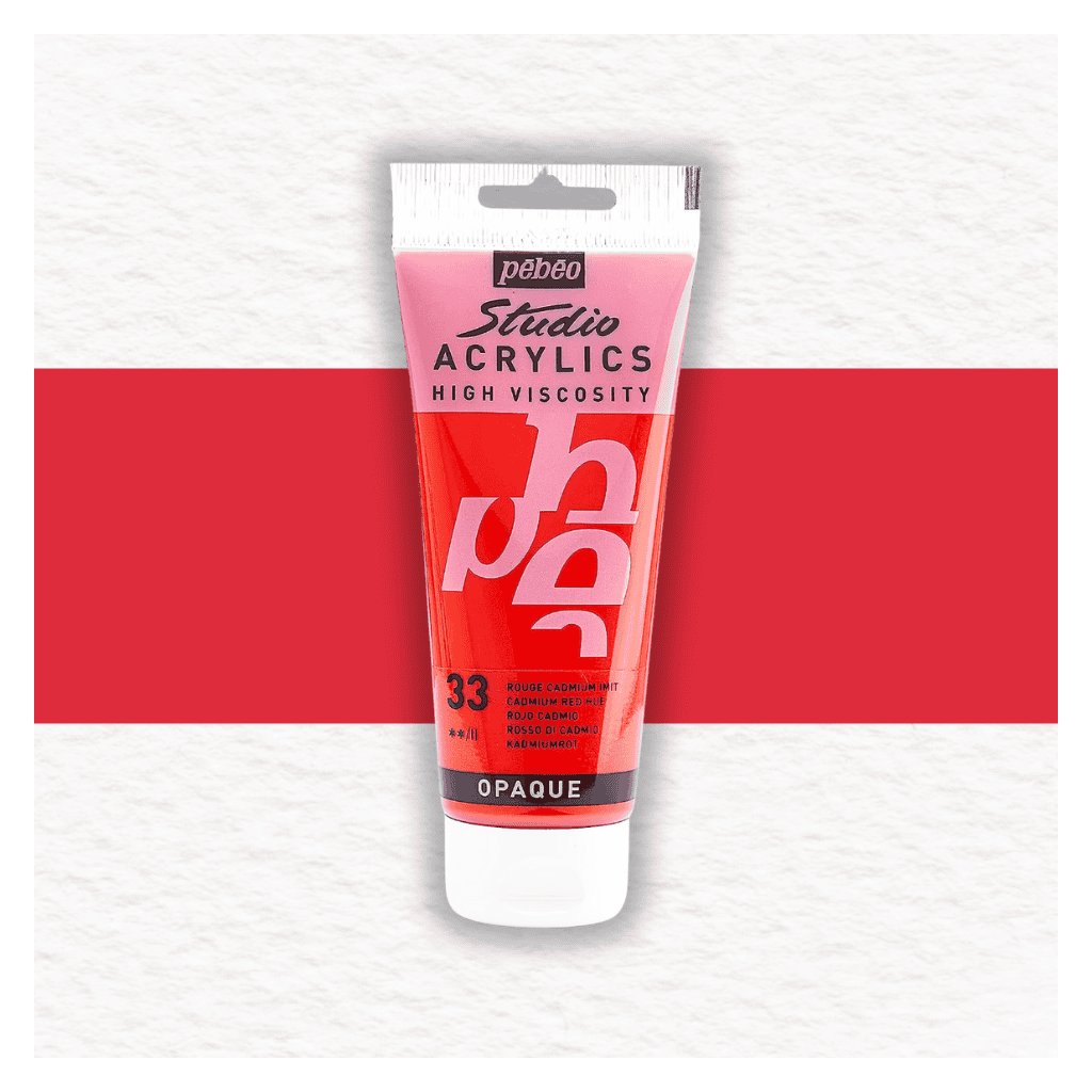 Akrylová farba Pébéo Studio Acrylics High Viscosity - 33 Cadmium Red Hue je farba so saténovým matným povrchom. Hustá konzistencia farby je po zaschnutí trvalá a film je pevný a pružný voči deformácii.