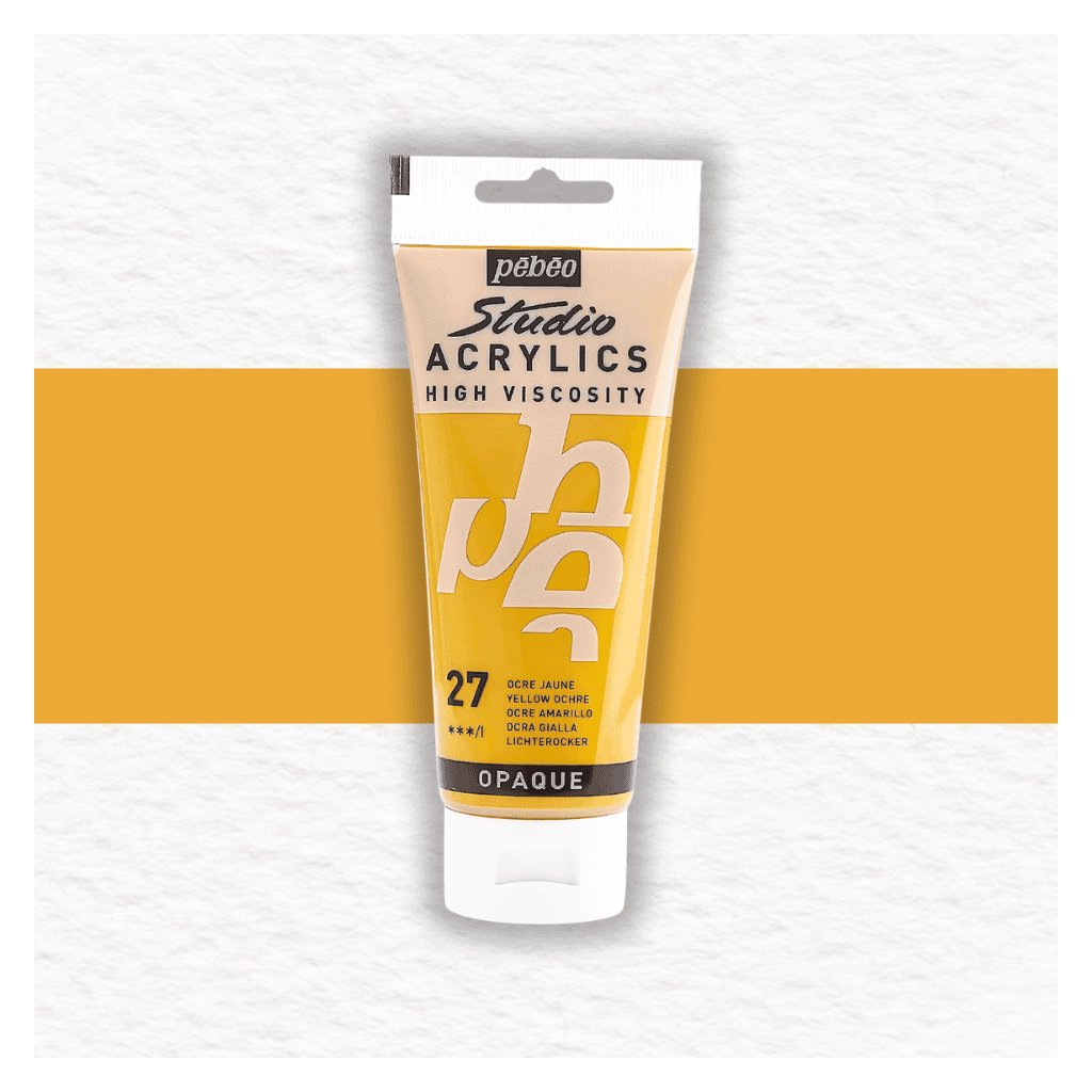 Akrylová farba Pébéo Studio Acrylics High Viscosity - 27 Yellow Ochre je farba so saténovým matným povrchom. Hustá konzistencia farby je po zaschnutí trvalá a film je pevný a pružný voči deformácii.
