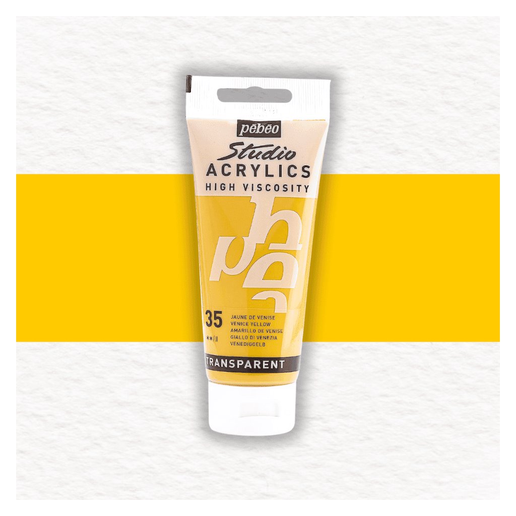 Akrylová farba Pébéo Studio Acrylics High Viscosity - 35 Venice Yellow je farba so saténovým matným povrchom. Hustá konzistencia farby je po zaschnutí trvalá a film je pevný a pružný voči deformácii.
