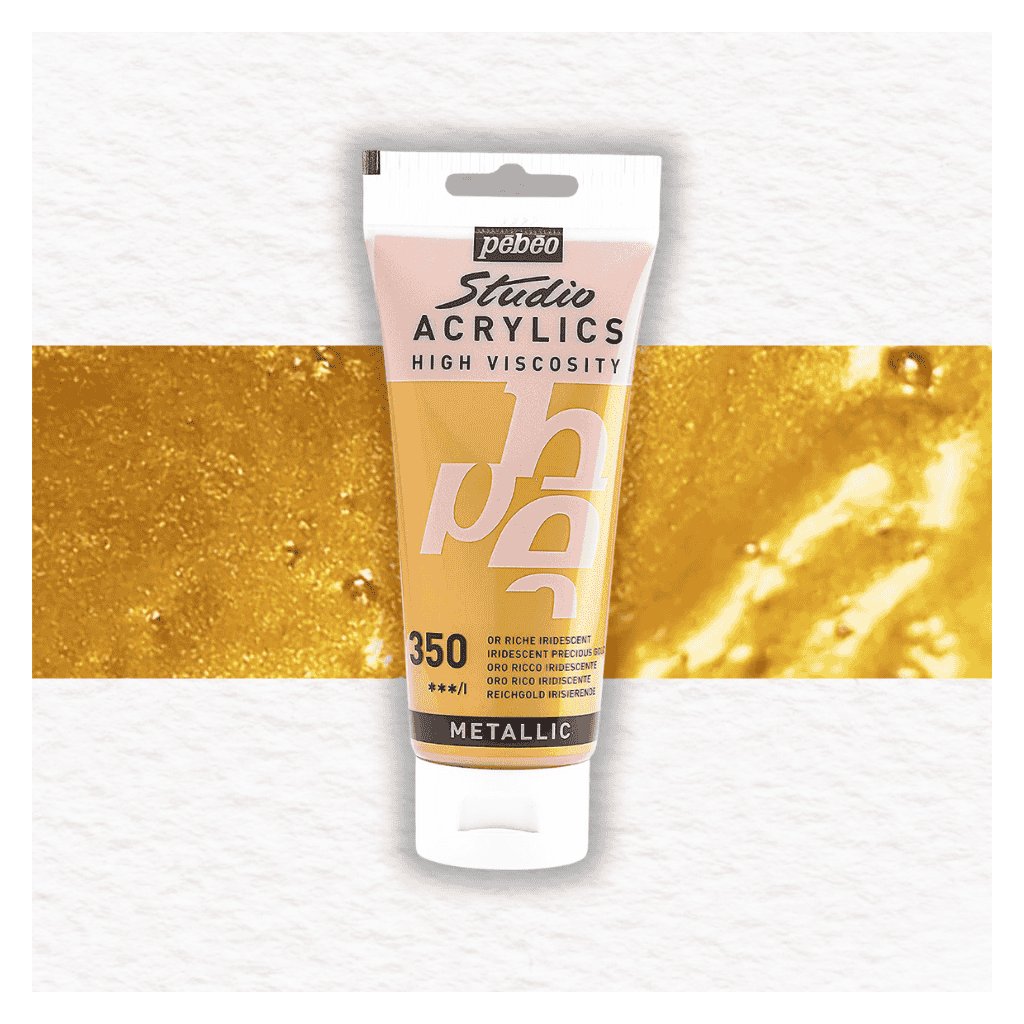 Akrylová farba Pébéo Studio Acrylics High Viscosity - 350 Iridescent Precious Gold je farba so saténovým matným povrchom. Hustá konzistencia farby je po zaschnutí trvalá a film je pevný a pružný voči deformácii.