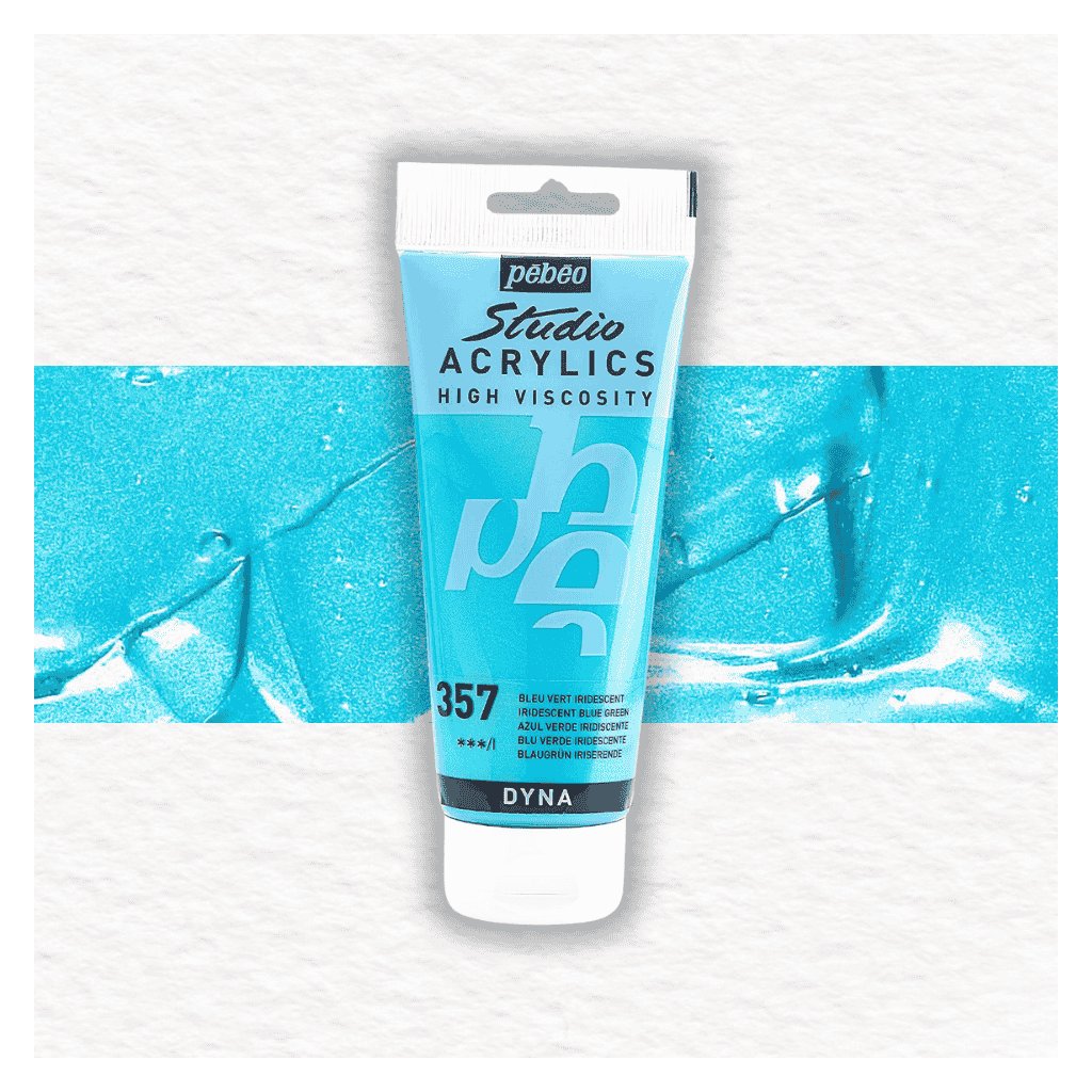 Akrylová farba Pébéo Studio Acrylics High Viscosity - 357 Iridescent Blue Green je farba so saténovým matným povrchom. Hustá konzistencia farby je po zaschnutí trvalá a film je pevný a pružný voči deformácii.