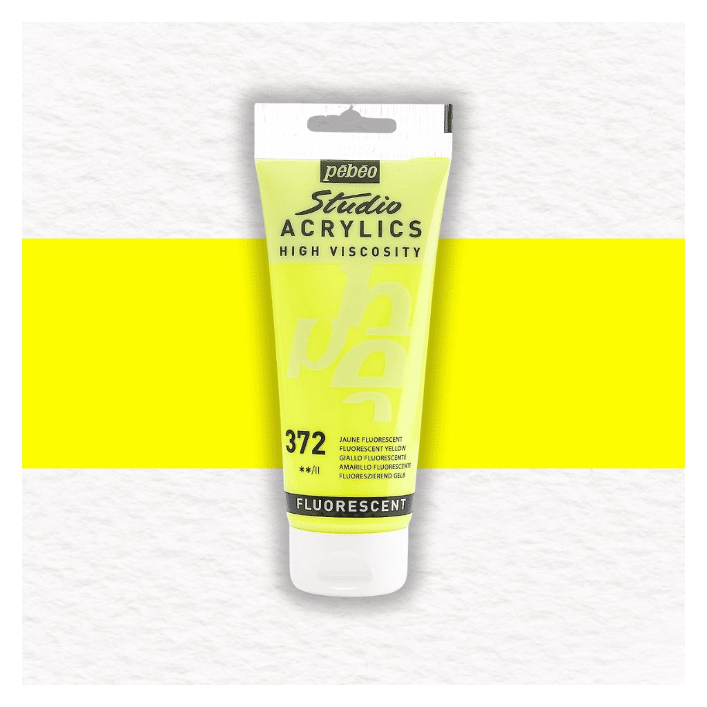 Akrylová farba Pébéo Studio Acrylics High Viscosity - 372 Fluorescent Yellow je farba so saténovým matným povrchom. Hustá konzistencia farby je po zaschnutí trvalá a film je pevný a pružný voči deformácii.