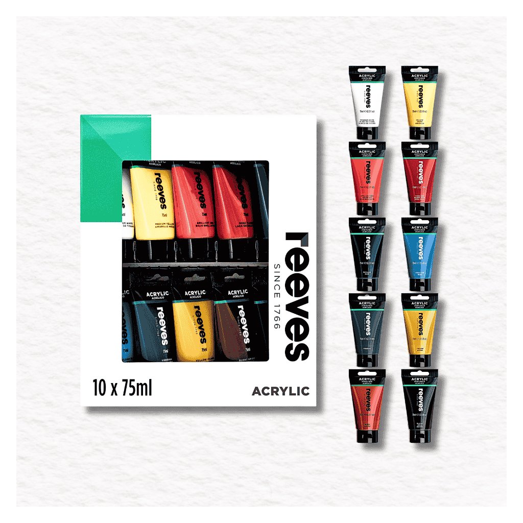 Akrylové farby Reeves - 10x75 ml sú perfektným spoločníkom na vašej ceste maľovania s akrylovými farbami. Relaxujte a oddýchnite si pri užívaní výrazných farieb, ktoré vám umožnia vytvoriť všetko od hrubých, výrazných ťahov až po hladké a rovnomerné povrchy.