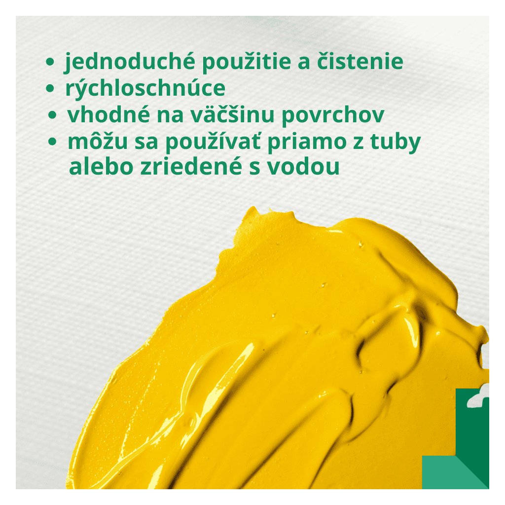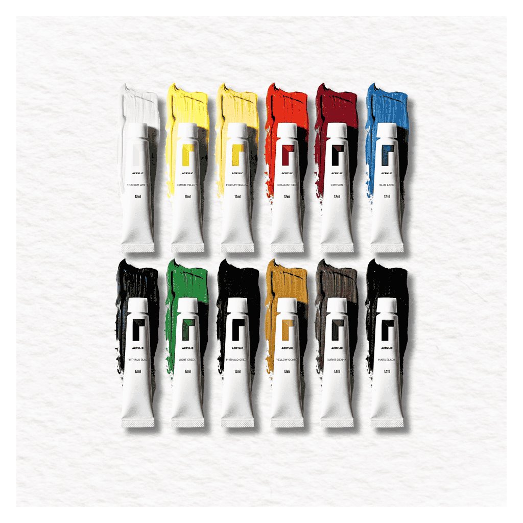 - odtiene: Titanium White, Lemon Yellow, Medium Yellow, Brilliant Red, Crimson Red, Blue Lake, Phthalo Blue, Light Green, Phthalo Green, Yellow Ochre, Burnt Sienna, Mars Black