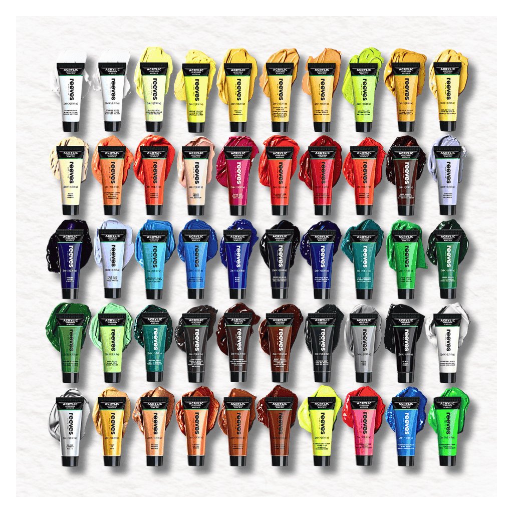 Akrylové farby Reeves - 50x22 ml sú perfektným spoločníkom na vašej ceste maľovania s akrylovými farbami. Relaxujte a oddýchnite si pri užívaní výrazných farieb, ktoré vám umožnia vytvoriť všetko od hrubých, výrazných ťahov až po hladké a rovnomerné povrchy.