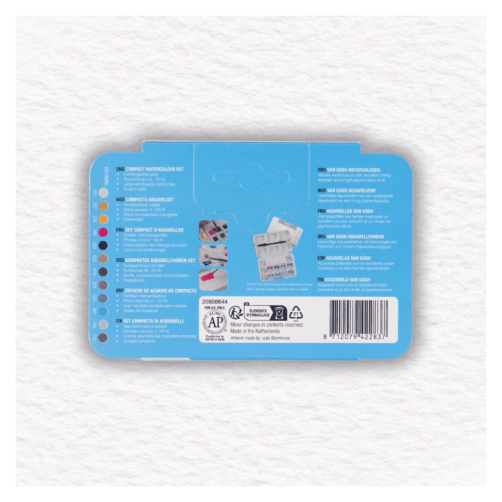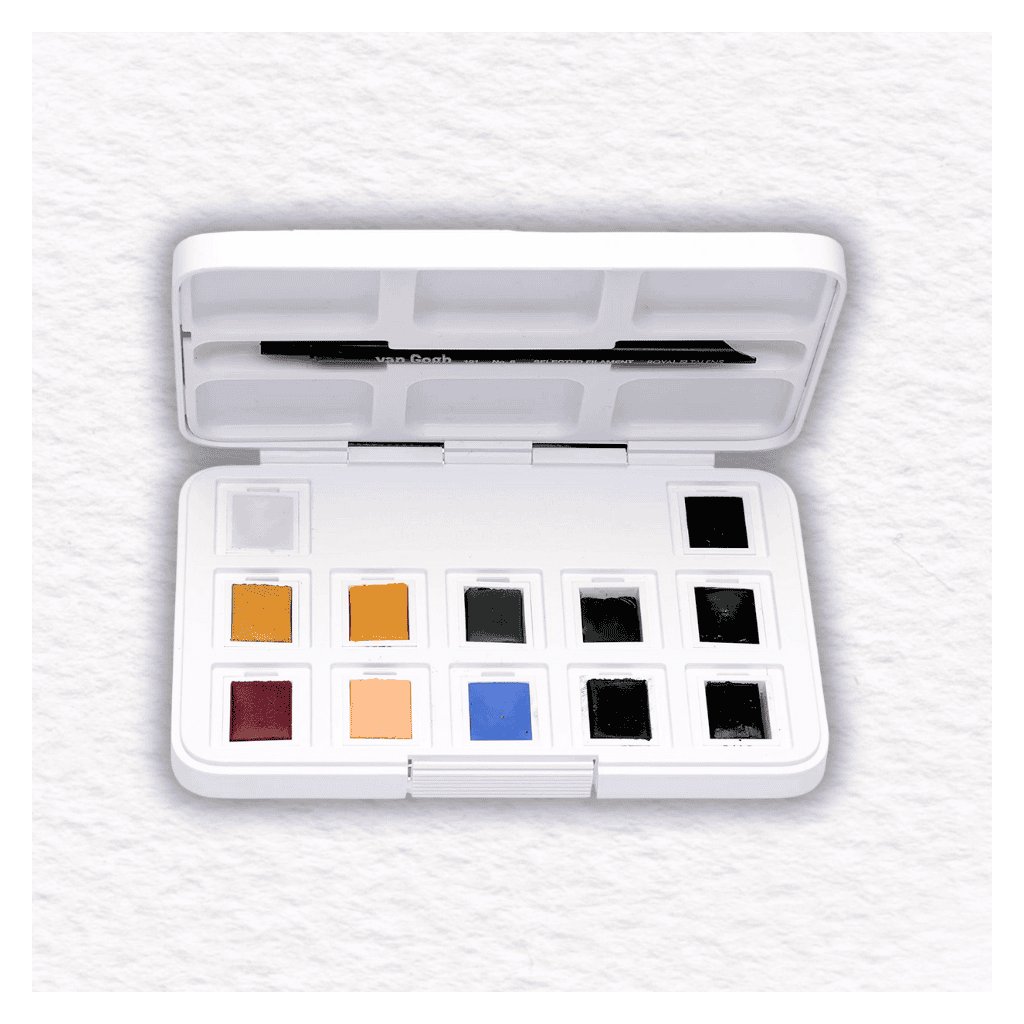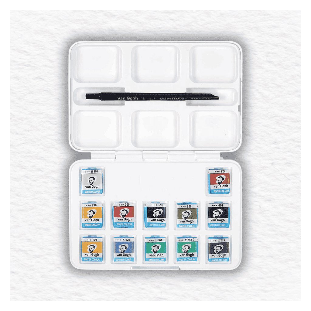 Sada akvarelových farieb Van Gogh Pocket Box Muted Colours - 12 polpanvičiek v plastovej krabičke obsahuje výber farieb, ktoré sú vhodné pre jesenné a zimné motívy. Sú hodnotené ako rozsah farieb pre študentov a umelcov.