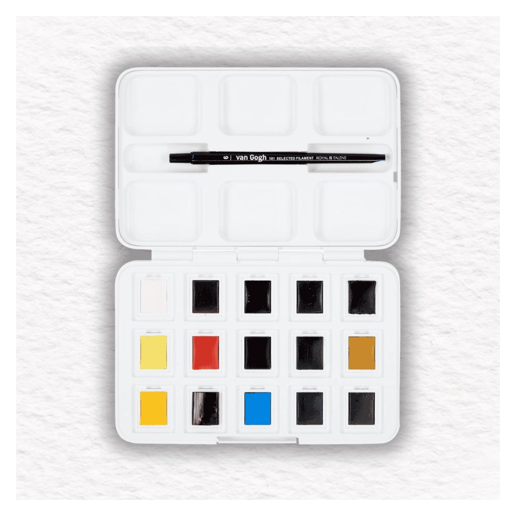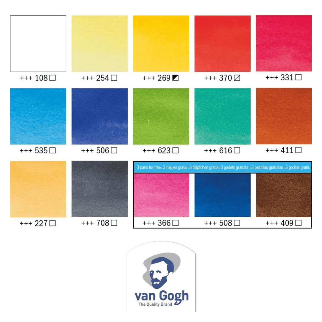 Sada akvarelových farieb Van Gogh Pocket Box - Basic Colours - 12 polpanvičiek + 3 farby zdarma v plastovej krabičke obsahuje všeobecný výber farieb. Sú hodnotené ako rozsah farieb pre študentov a umelcov.