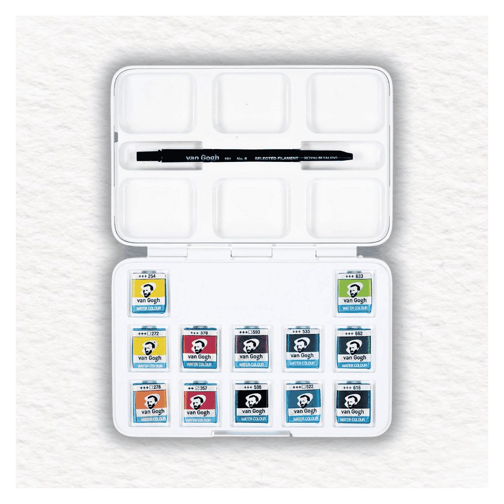 Sada akvarelových farieb Van Gogh 12 celých panvičiek v plechovej krabičke obsahuje výber brilantných, transparentných, intenzívnych farieb s vysokou tónovacou silou.