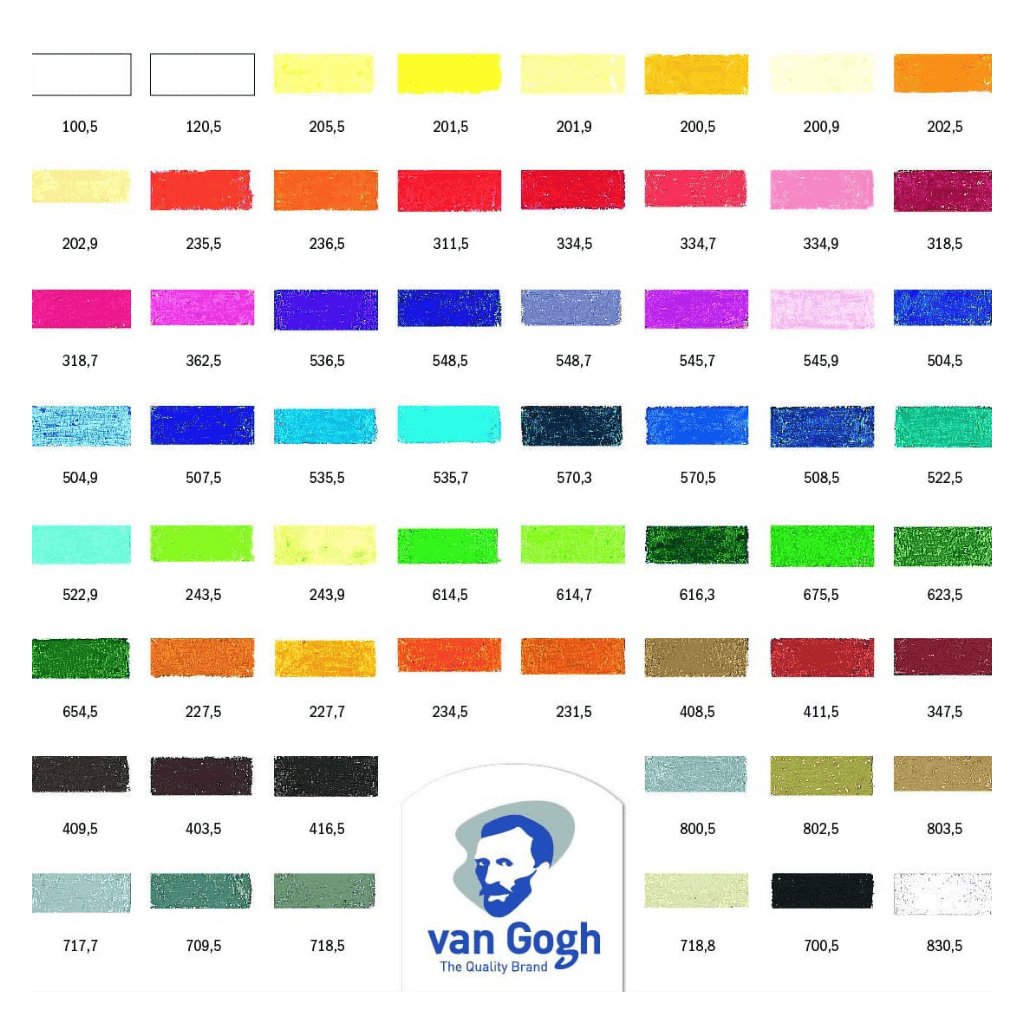 Olejové pastely Van Gogh Complete Set - 60 ks sú krémové umelecké pastely. Ideálne sa hodia pre tých, ktorí chcú začať maľovať olejovými pastelmi. Môžu byť tiež použité v kombinácii s inými suchými alebo mokrými médiami. Poskytujú vynikajúce výsledky pre serióznu pastelovú alebo olejovú maľbu na papier alebo plátno. Pastely je možné použiť priamo, nanášať vo farebných vrstvách, zmiešať s handričkou alebo riediť minerálnym liehom.