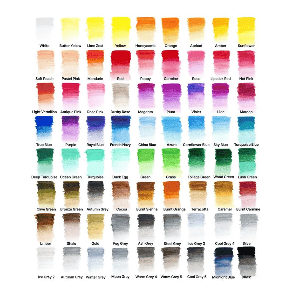 - White ○ Butter yellow ○ Lime zest ○ Yellow ○ Honeycomb ○ Orange ○ Apricot ○ Amber ○ Sunflower ○ Soft peach ○ Pastel pink ○ Mandarin ○ Red ○ Poppy ○ Carmine ○ Rose ○ Lipstick red ○ Hot pink ○ Light vermilion ○ Antique pink ○ Rose pink ○ Dusky rose ○ Magenta ○ Plum ○ Violet ○ Lilac ○ Maroon ○ True blue ○ Purple ○ Royal blue ○ French navy ○ China blue ○ Azure ○ Cornflower blue ○ Sky blue ○ Turquoise blue ○ Deep turquoise ○ Ocean green ○ Turquoise ○ Duck egg ○ Green ○ Grass ○ Foliage green ○ Wood green ○ Lush green ○ Olive green ○ Bronze green ○ Autumn grey Cocoa ○ Burnt Sienna ○ Burnt orange ○ Terracotta ○ Caramel ○ Burnt carmine ○ Umber ○ Shale ○ Gold ○ Fog grey ○ Ash grey ○ Steel grey ○ Ice grey 3 ○ Cool grey 4 ○ Silver ○ Ice grey 2 ○ Autumn grey ○ Winter grey ○ Moon grey ○ Warm grey 4 ○ Warm grey 5 ○ Cool grey 5 ○ Midnight blue ○ Black