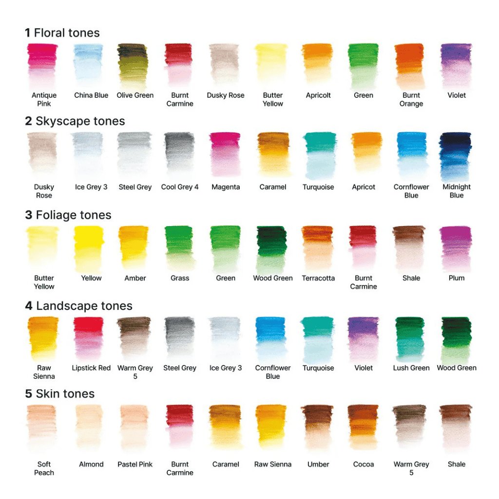 - skin odtiene: soft peach ○ almond ○ pastel pink ○ burnt carmine ○ caramel ○ raw Sienna ○ umber ○ cocoa ○ warm grey 5 ○ shale